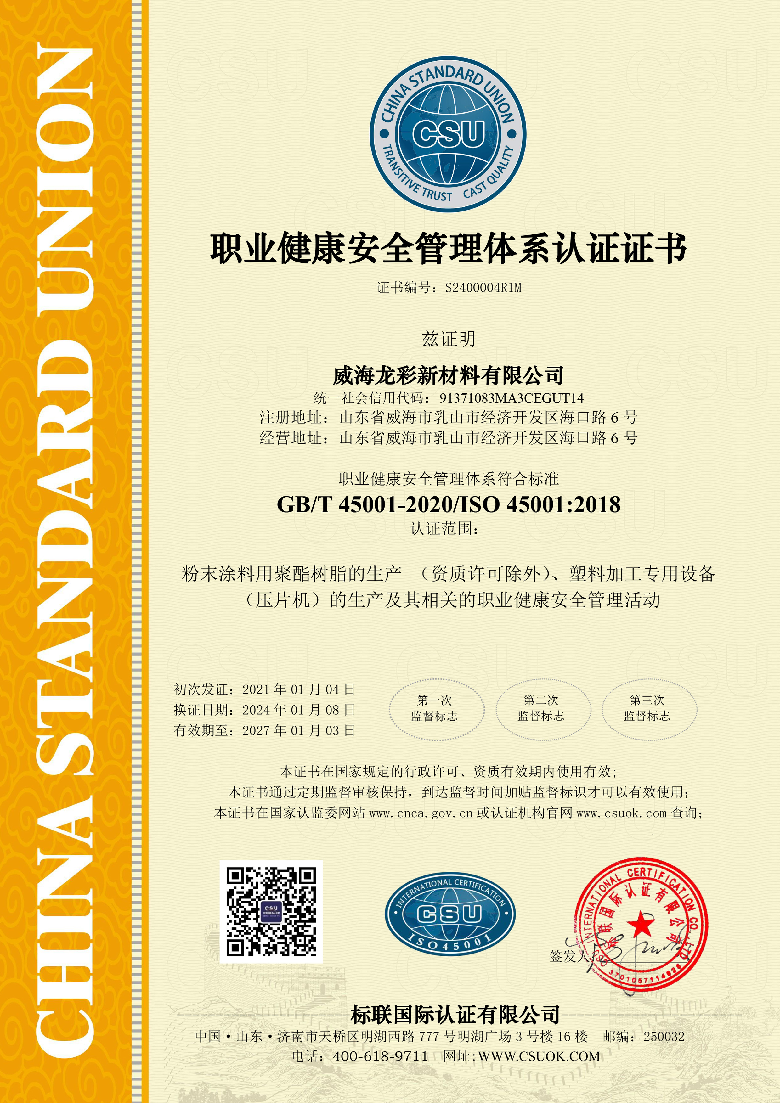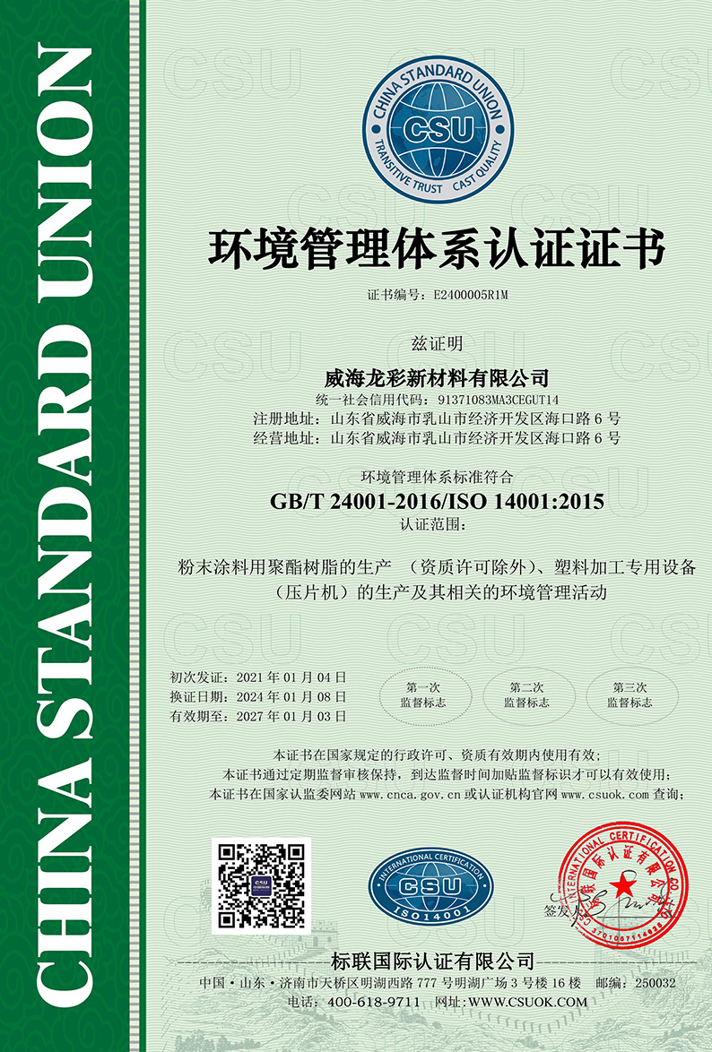 龍彩新材料有限公司成立于2007年,是致力于粉末涂料用樹脂及特殊樹脂研發和制造的高新技術企業。公司以可持續發展為目標,技術創新為驅動力,為粉末涂料市場提供優質的產品與服務。龍彩現已通過質量質量管理體系認證ISO9001和環境管理體系認證ISO14001,并因其在可持續發展的努力和目標在2023年首次榮獲Ecovadis金牌認證,名列全球前5%。
