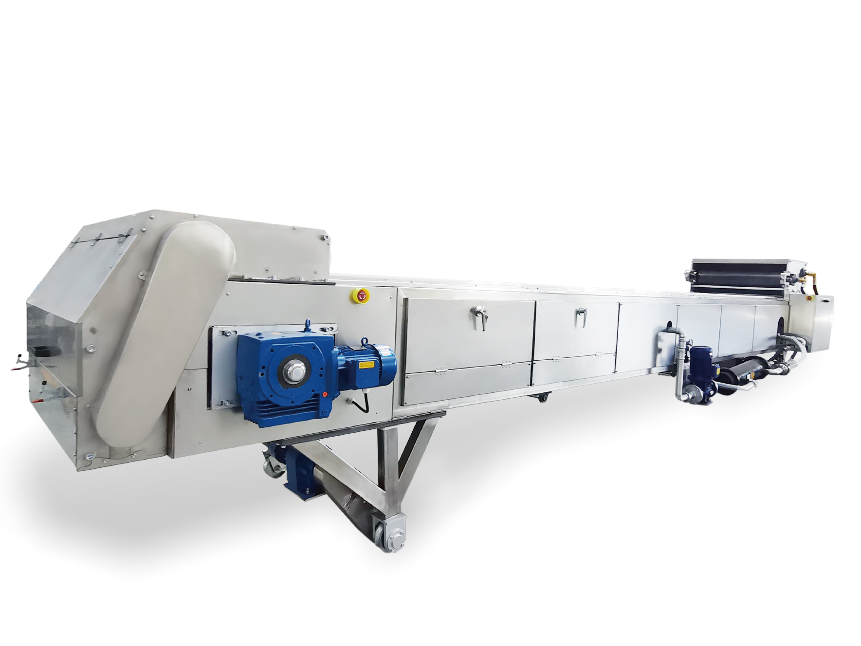 YPJ系列風冷鏈板式壓片破碎機YPJ系列不銹鋼鏈板壓片機由冷卻壓輥、不銹鋼節(jié)片輸送帶、破碎和風冷系統(tǒng)組成。擠出機擠出的熱熔融狀物料經(jīng)冷卻壓輥壓成1-2mm帶狀,在不銹鋼節(jié)片輸送帶上風冷至常溫,破碎成片狀物料排出。可選配有空氣過濾,冷熱交換系統(tǒng)。